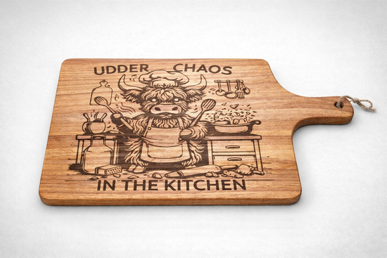| Select Board Style | Udder Chaos, Annoying the Cook, Because Chop Happens, Dinner is Ready, Evidence Has Been Chopped, I am sorry for what I said, Kitchen Conversion Chart, No Bitchin’ in the Kitchen, Oh for Forks Sake!, OMG, She Has a Knifed Engraved Cutting Board, One Day I’m Gonna Make the Onions Cry, Rise and Shine, Mother Cluckers |
